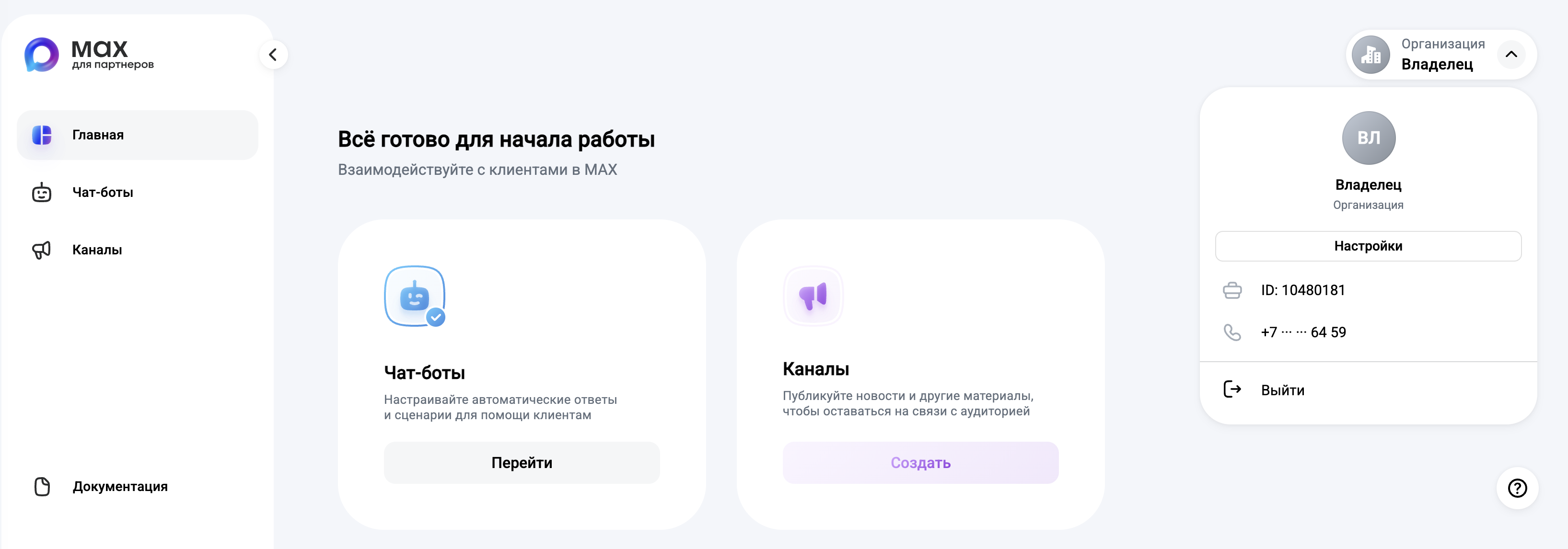 Перейдите на платформу MAX для партнёров и в правом верхнему углу нажмите на профиль организации. В открывшемся блоке вы увидите: